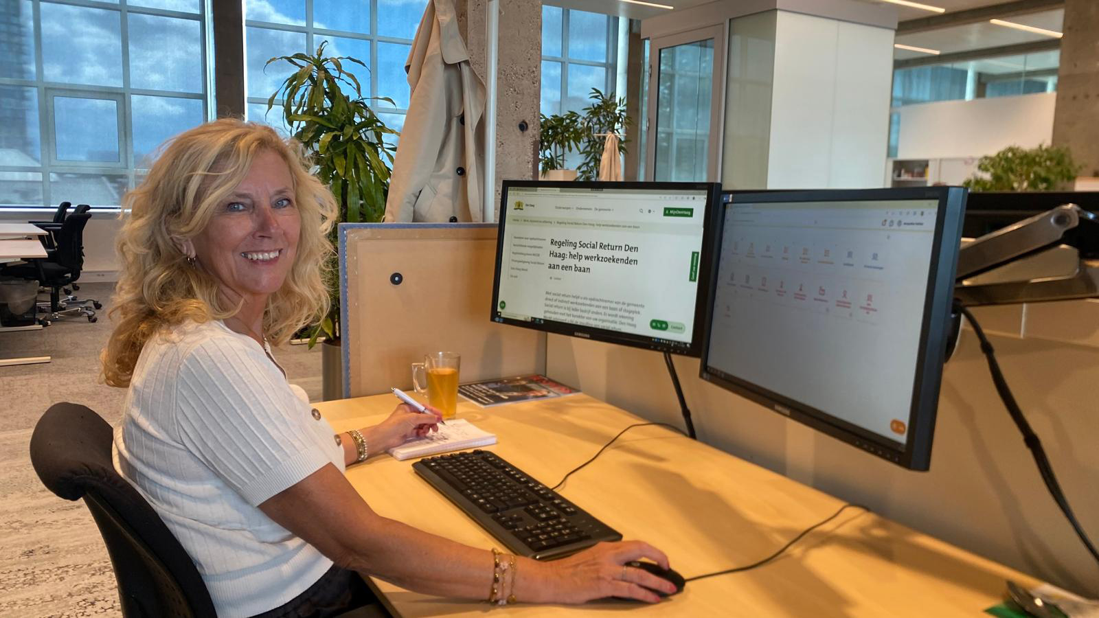 “Ik ben niet meer de jongste en heb al veel verschillende banen gehad. Ik was een tijd uit het arbeidsproces door mijn kinderen. In die tijd heb ik cursussen gevolgd en veel vrijwilligerswerk opgepakt. Het thuiszitten beviel me helemaal niet en ik wilde weer aan de slag, maar ik wist niet wat dan precies. Ik wilde niet weer aan het werk als secretaresse, dat werk boeide me eigenlijk niet. Ik wilde meer uitdaging. Bij Den Haag Werkt kreeg ik een coach. Zij hielp me om te ontdekken wat ik echt wilde. Zo kwam ik via VolkerWessels Inclusief bij Vialis terecht. Zij waren bezig met de bouw van de Haagse Bediencentrale. Eerst deed ik wat klusjes, daarna kreeg ik meer verantwoordelijkheden. Ik bleek goed in documentatie en uitzoekwerk. Nu werk ik bij KWS en doe daar vergelijkbaar werk.