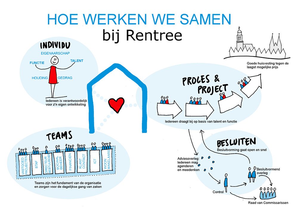Voordat Rentree (nu 38 medewerkers) kon bouwen aan een nieuwe organisatie met nieuwe werkwijzen moesten er een paar harde noten worden gekraakt. Taken werden samengevoegd tot bredere functies, waardoor het onvermijdelijk was om afscheid te nemen van sommige medewerkers. Niet leuk, wel nodig. Na die slag kon het opbouwen beginnen. Hoe?